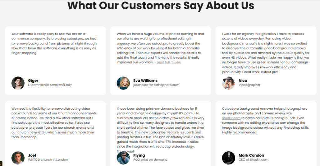 Cutout Pro is praised for its efficiency, user-friendly interface, and the quality of its AI-driven tools. Here’s what some satisfied users have to say: