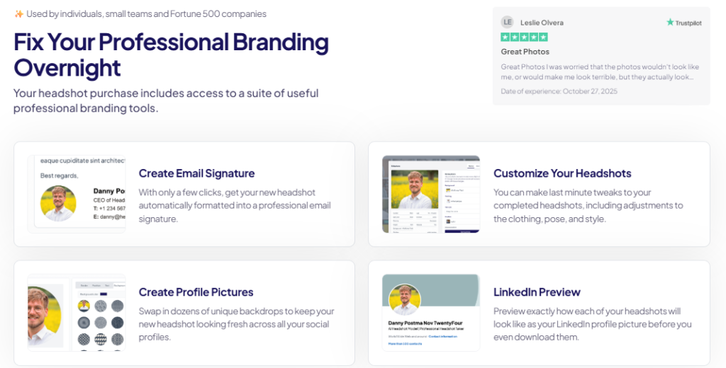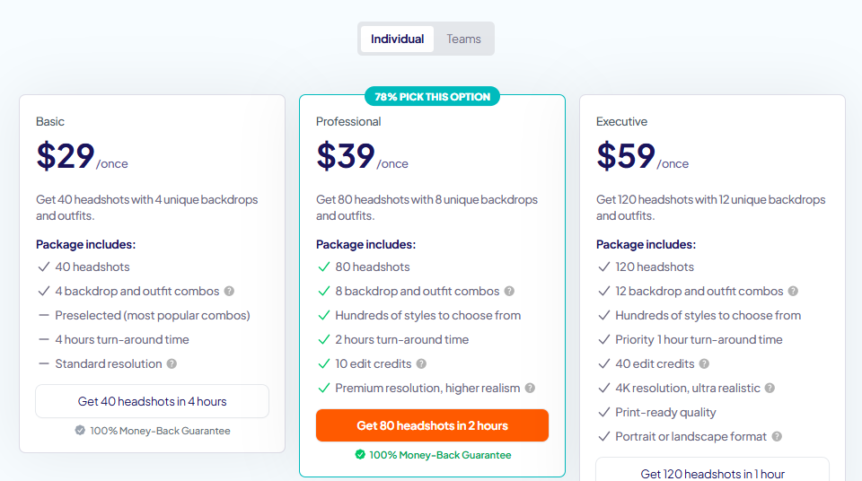 HeadshotPro offers an affordable and accessible way to get high-quality headshots compared to traditional photography. With pricing starting at $29 per shoot, it provides an excellent cost-to-value ratio, especially for businesses or individuals who need multiple headshots. The platform’s pricing tiers cater to both individuals and teams, making it a versatile solution for a wide range of users.
