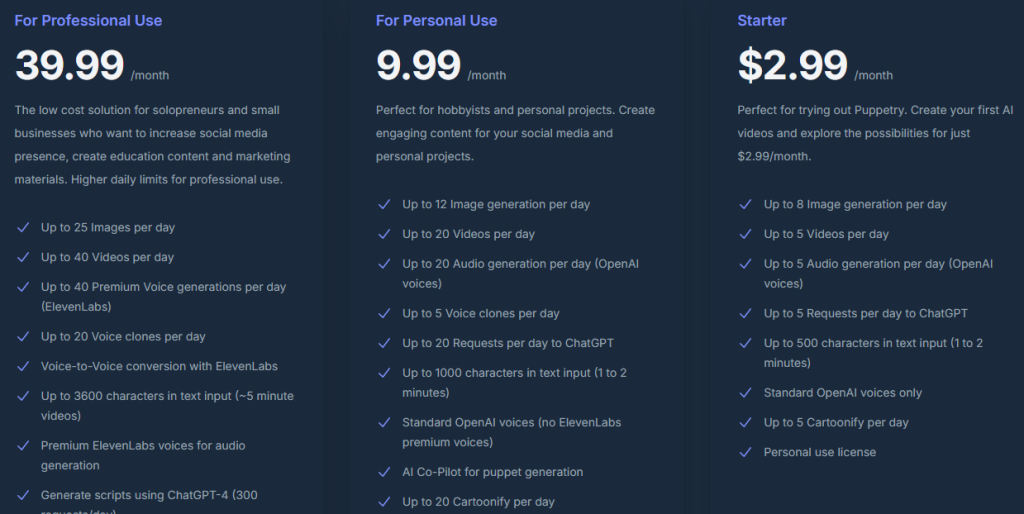 Puppetry offers great value for money, especially considering the unlimited generation of puppets and videos in lower-tier plans. - Free Trial Availability