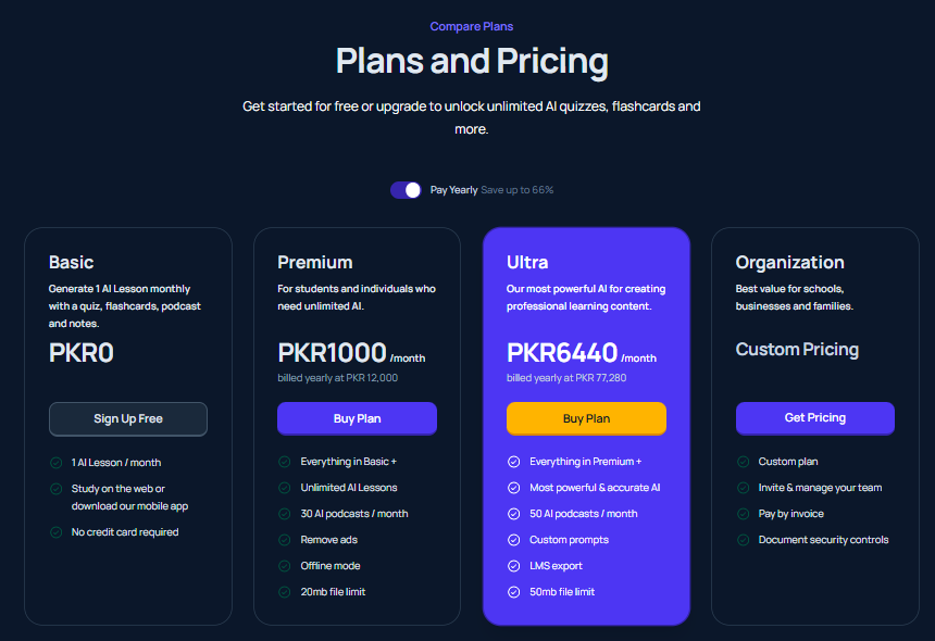 Quizgecko is a highly cost-effective solution, especially for students and educators who need a tool to create quizzes and study materials regularly. The freemium model is great for light users, while the Premium and Ultra plans provide robust features for those requiring more advanced tools.