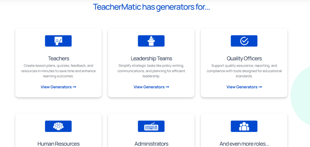 Beyond individual use, TeacherMatic offers enterprise solutions, allowing schools and districts to streamline processes and monitor content quality at scale.