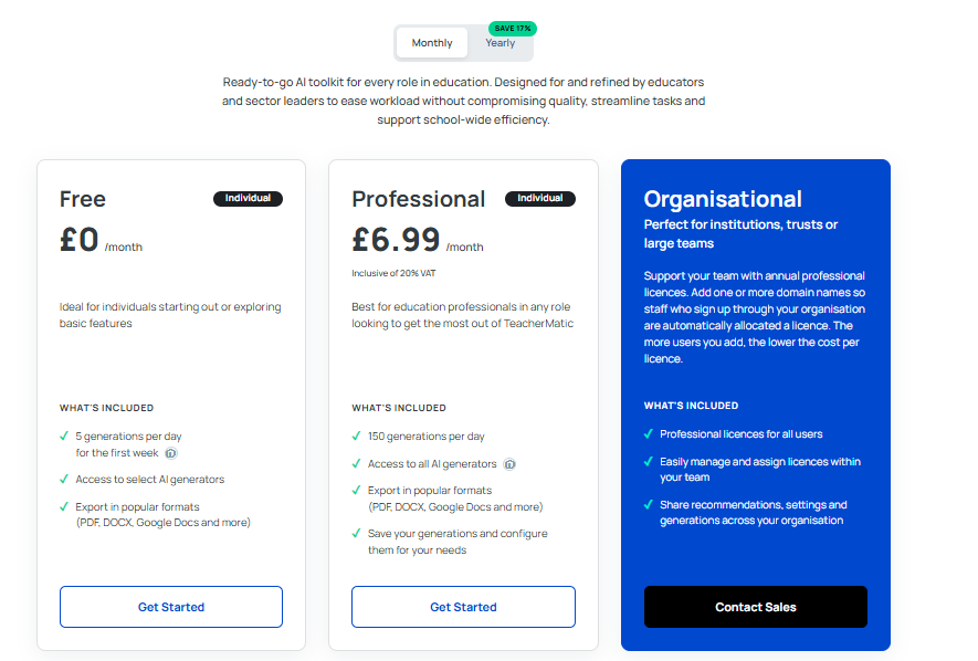 TeacherMatic provides excellent value for money. The free plan is great for teachers with limited needs, while the Standard and Premium plans offer significant time savings and advanced features for those looking to maximize efficiency in lesson planning and assessment creation.